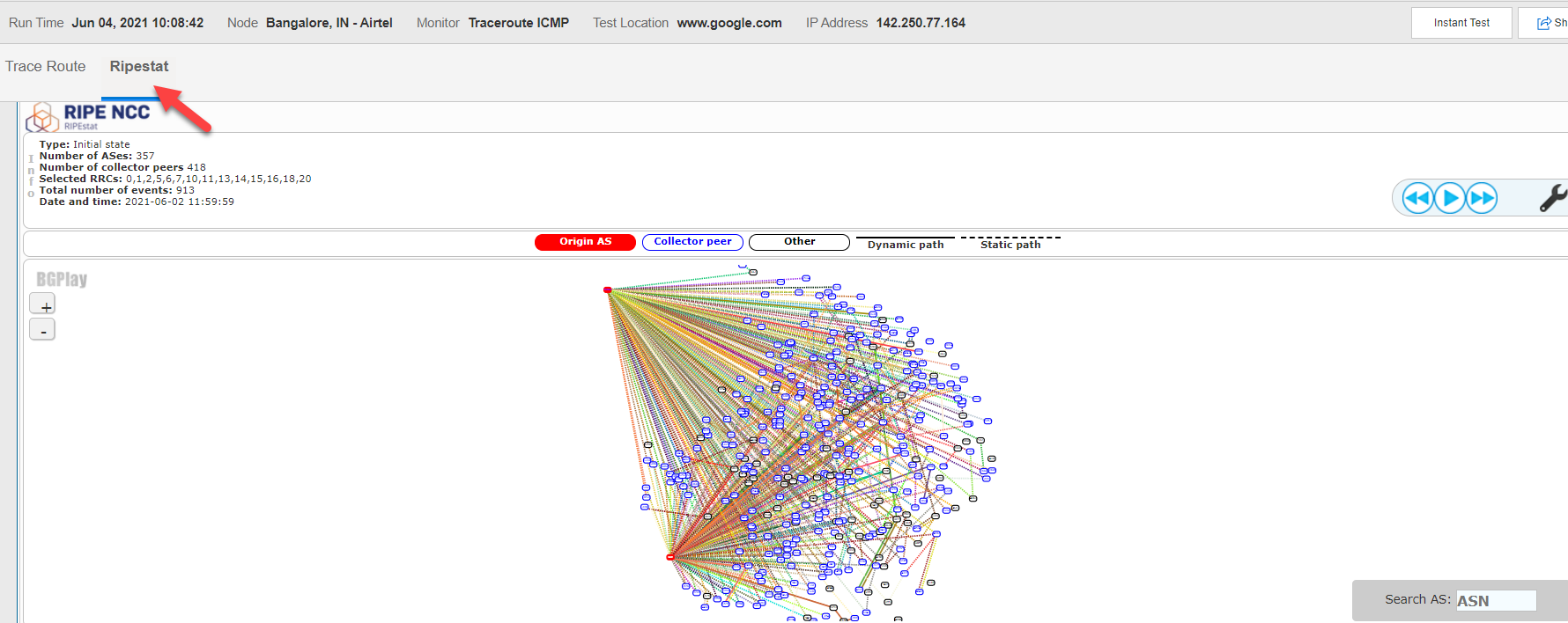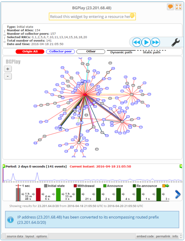 これは、特定のリソース(プレフィックス、自律システム、IP)に関連するルーティングの履歴を、アニメーションと高度なインタラクティブ性を持つグラフによって表示します。