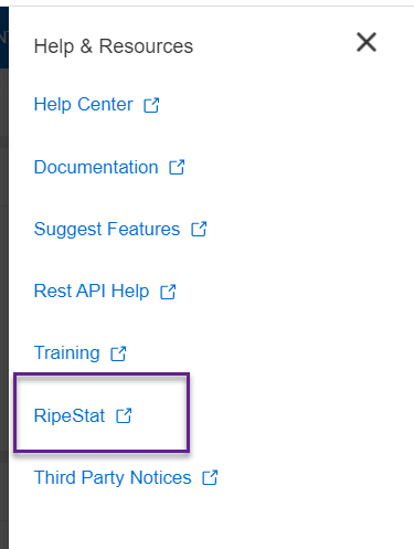 もしくは、右上の「?」マークのアイコンをクリックし、「RipeStat」を選択しUIからRIPEのWebサイトにアクセスします。